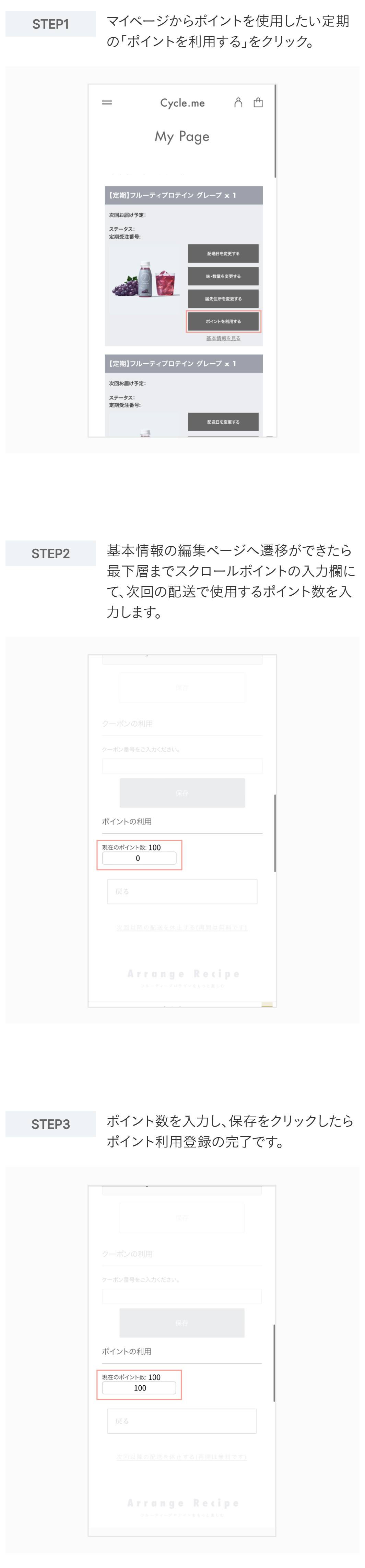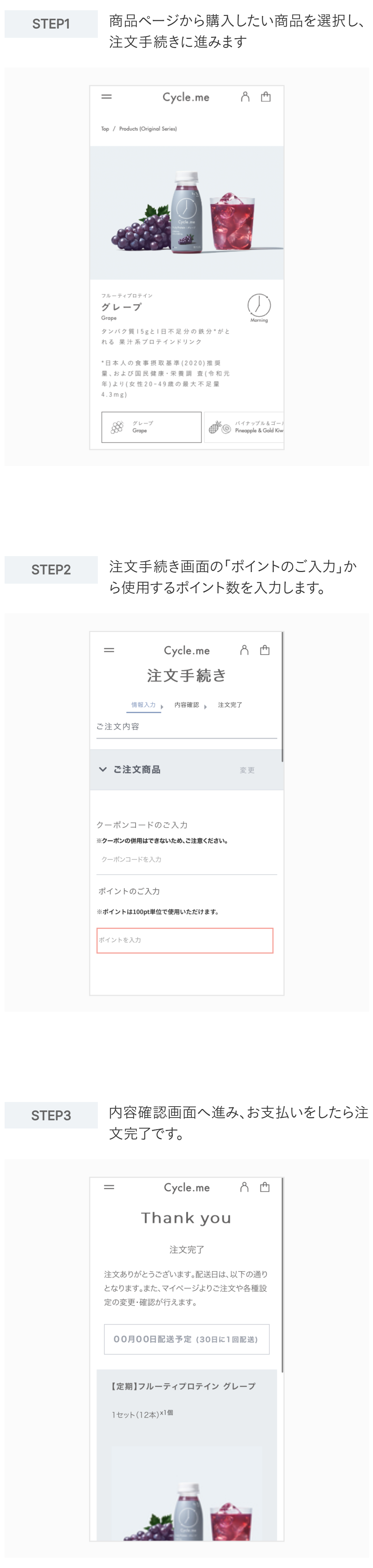 定期購入でポイントを利用する場合、次回商品の発送が確定した時点で反映されます。