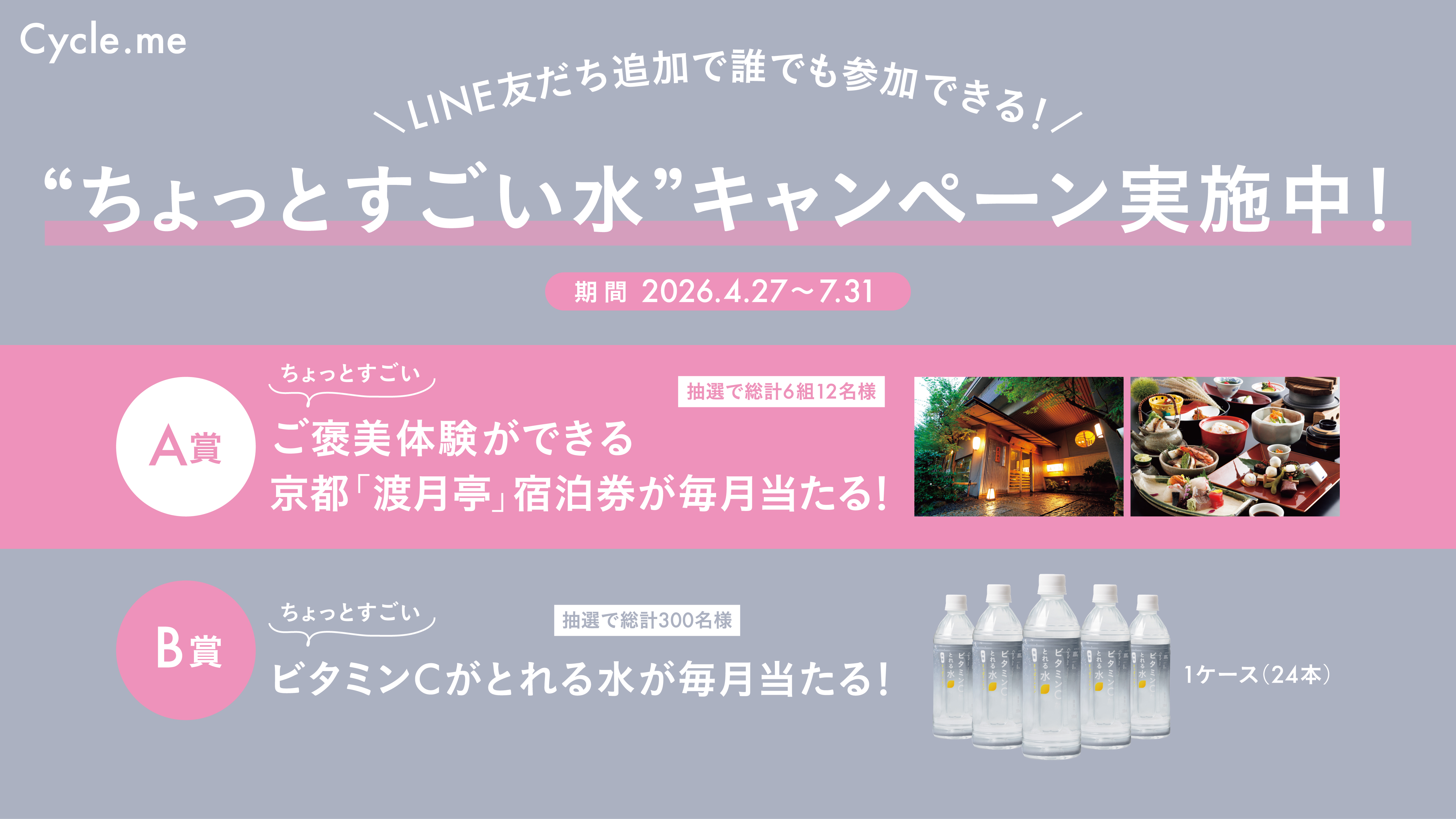 サイクルミー公式LINEを友だち追加のうえご応募いただくと、京都「渡月亭」宿泊券や、「ビタミンCがとれる水」1ケースが抽選で当たるキャンペーンです。